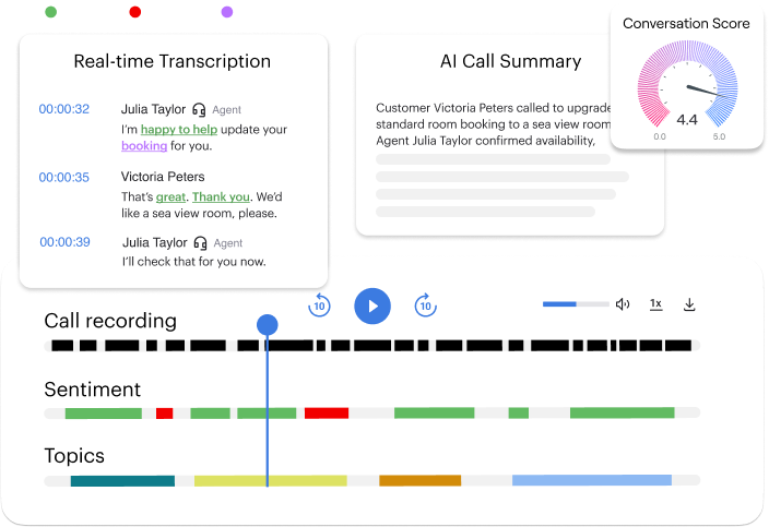 Gain a live view into every customer interaction with real-time agent status, call metrics, and transcription.