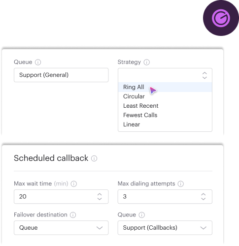 Scheduled callbacks include configurable attempts, retry intervals, and automatic failover to a queue, while flexible queue strategies support fair distribution and faster answer times.