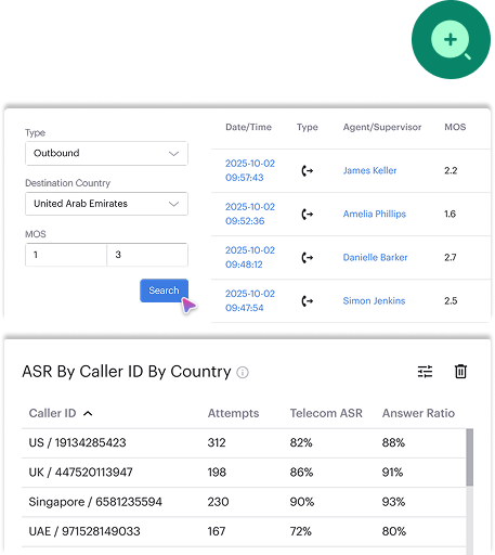 Supervisors get real-time dashboards for agents, queues, campaigns, and numbers, along with historical reports like ASR by country by hour to separate telecom behavior from platform performance.