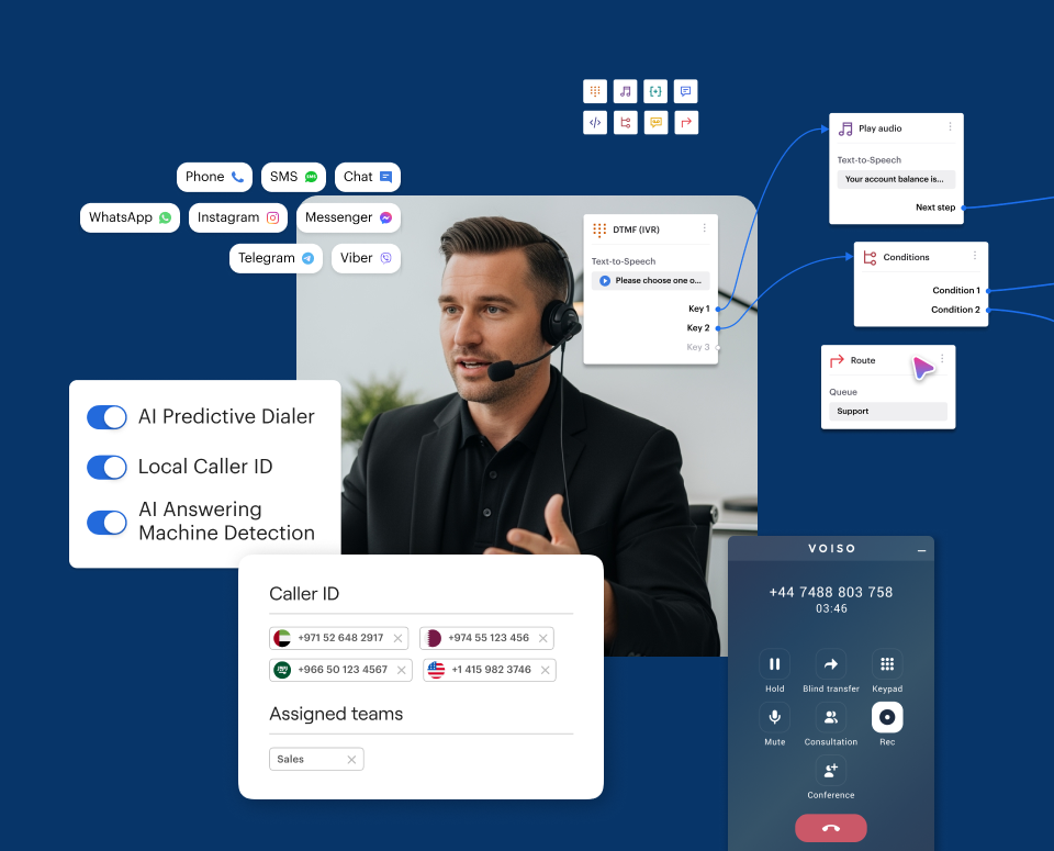 Voiso’s drag-and-drop Flow Builder lets you create complex IVR menus, routing rules, queues, and multilingual text-to-speech experiences in minutes.