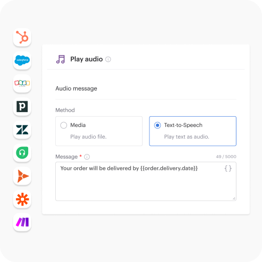 With Flow Builder, create dynamic TTS messages using CRM data to quickly resolve inquiries, from checking orders and account balances to booking appointments and troubleshooting.