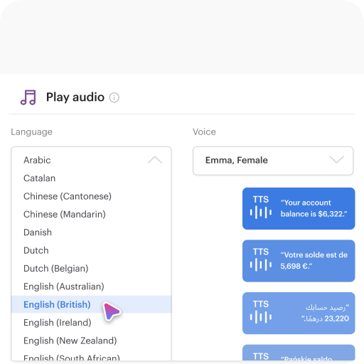 Enhance CX with TTS in 20+ languages, including English, French, Spanish, and Arabic.